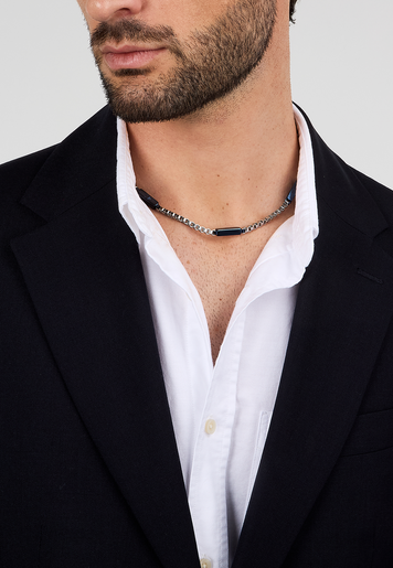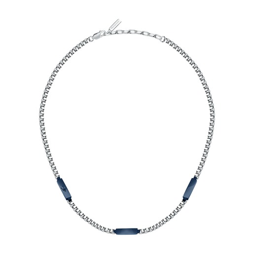 Collar para hombre Maserati, colección ICONIC en acero, referencia JM425AVD109, en color plateado con tres detalles en azul, longitud 45 + 5 cm. La joya se caracteriza por un diseño tipo cadena en acero con toques de color que refuerzan su estilo contemporáneo y distintivo. Incorpora un práctico cierre de joyería que garantiza comodidad y seguridad. Se presenta en su embalaje original Maserati, acompañado de un certificado de autenticidad y con una garantía de 2 años. Joyería Maserati: líneas icónicas y acabados refinados dan forma a collares y pulseras de acero que combinan elegancia, innovación y carácter deportivo.