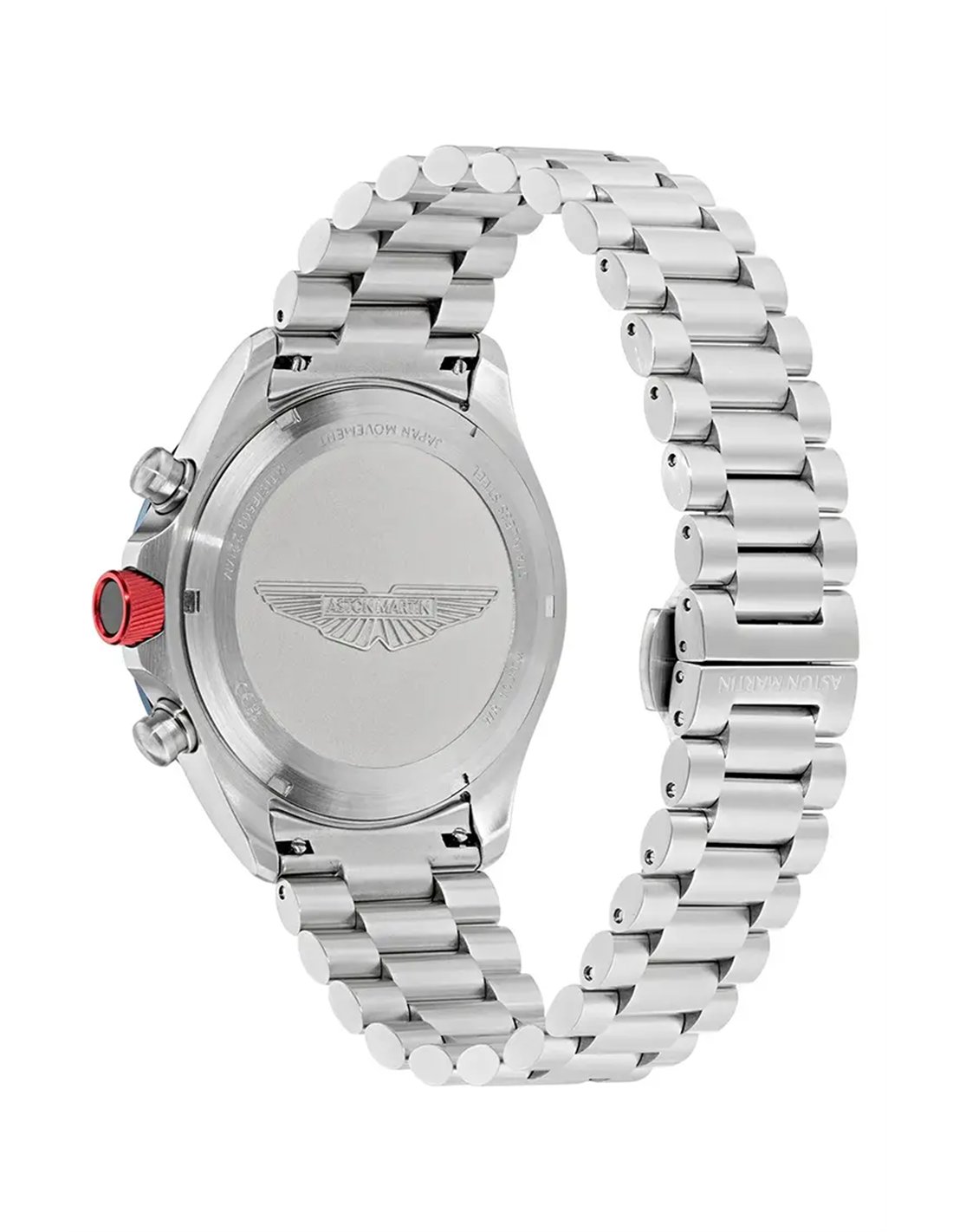 Reloj de hombre Aston Martin SPT con caja de acero inoxidable reciclado brillante de 44 mm, cronógrafo, esfera azul marino con subesferas en azul claro, brazalete de acero y bisel negro con escala taquimétrica. Un reloj que combina estilo fresco y sutil con energía sport-luxe, reforzando el espíritu audaz de Aston Martin inspirado en las carreras.