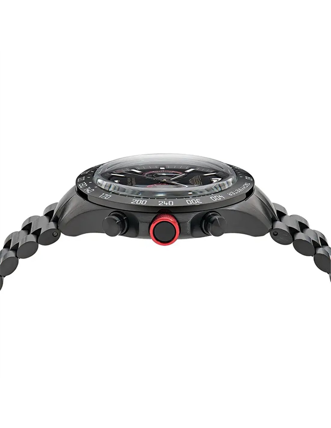Reloj de hombre Aston Martin SPT con caja IP negra de acero inoxidable reciclado brillante de 44 mm, cronógrafo, esfera negra con subesferas negras, brazalete negro y bisel negro con escala taquimétrica. Un reloj que combina carácter minimalista y potente con detalles rojos que aportan contraste dinámico, reforzando el espíritu audaz de Aston Martin inspirado en las carreras.