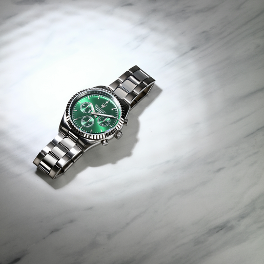 Reloj Maserati para hombre, ref. R8853100044, colección Competizione, en acero inoxidable, con movimiento de cuarzo y función cronógrafo. El reloj cuenta con una caja de acero inoxidable de 43 mm de diámetro y un elegante bisel texturizado en tono plateado que enmarca la esfera. La esfera verde está adornada con detalles en tono plateado y tres subesferas que incluyen funciones de visualización de la fecha y del día de la semana. Los índices y las agujas de hora, minutos y segundos también están acabados en tono plateado. El brazalete es de acero inoxidable, lo que garantiza durabilidad y elegancia. Resistencia al agua hasta 100m (10 ATM). El reloj se presenta en su embalaje original y viene con un certificado de garantía de 2 años.