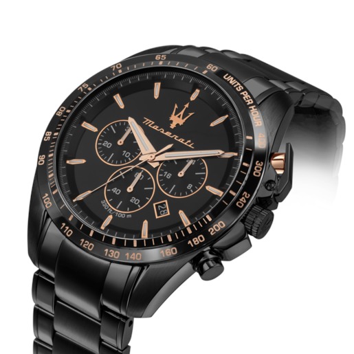 Reloj Maserati Hombre Acero IP Negro decoración Rosé. R8873612048 TRAGUARDO 45MM CHR BLACK DIAL BR BLACK MASERATI